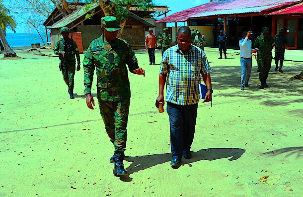 On 18th Aug 23, the Administrator of Mocimboa da Praia, Mr Sergio Domingo Cypriano accompanied by Zito Navaca the director of Serviço de Informações e Segurança do Estado (SISE) translated as the Director of the State Information and Security Service, Superintendent Alberto Elia Nampovo the District Police Commander, Senior Superintendent Januario João Jagaia the District Police head operations, Maj Albertino A Nabelo Navy Commander, Izìdro Periacela the Chita Battalion Commander and Celestino Peliduos the Local Force Commander made a familiarisation visit to Rwanda Security Force Headquarters (RSF HQs) in Mocimboa da Praia Town.