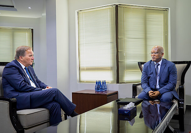 Today, 4 September 2023, Minister of Defence, Juvenal Marizamunda received in his office HE Stefan Löfven, former Prime Minister of Sweden and the current Chairperson of the Stockholm International Peace Research Institute (SIPRI) Governing Board.