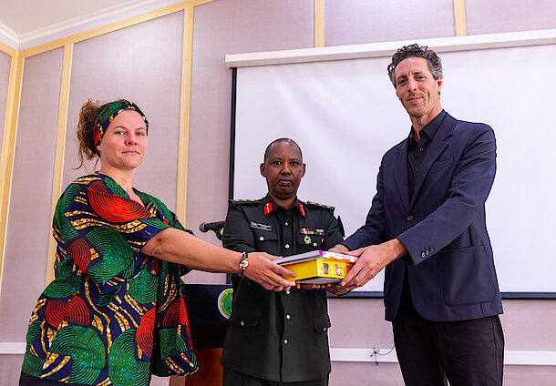 The Deputy Commandant of Rwanda Military Academy, Col Franco Rutagengwa received the equipment that was delivered by Mr Johan-Hilel Hamel, Director of French Institute of Rwanda who was accompanied by Col Frédéric Gautier, in charge of the sub-Saharan African to the Directorate of Cooperation of Security and Defence and Col Nicolas Dufour, Defence Attaché at the Embassy of France in Rwanda.