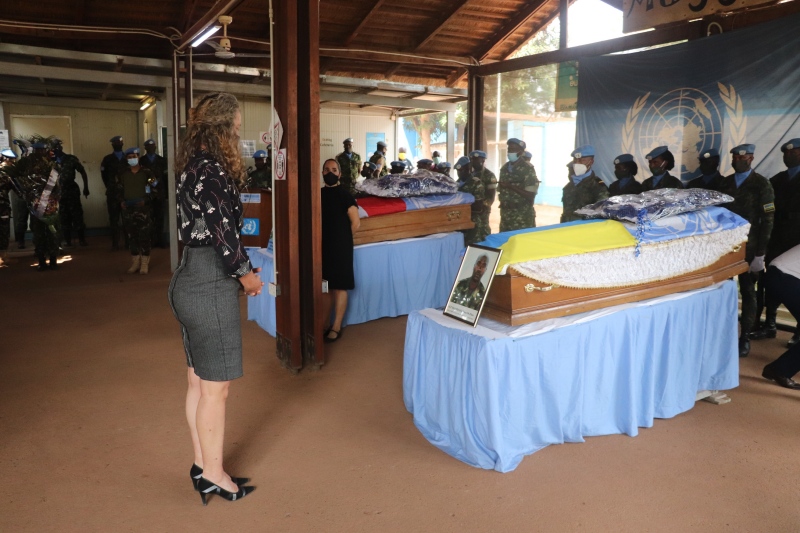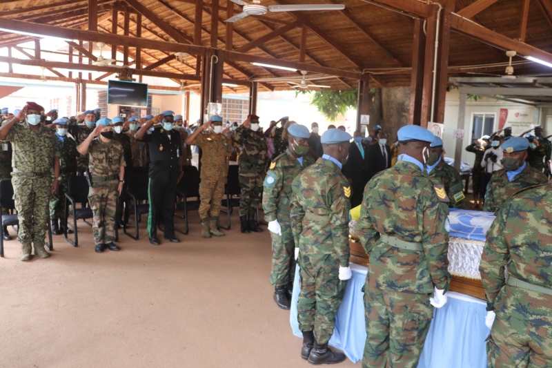 The Mission bid a final farewell to the fallen peacekeeper in a memorial ceremony held at MINUSCA force Headquarters. In attendance were the Deputy Special Representative of the UN Secretary General in CAR Denise Brown, the MINUSCA Force Commander General Sidiki Traoré and CAR Army Chief of Staff, General Zephirin Mamadou.