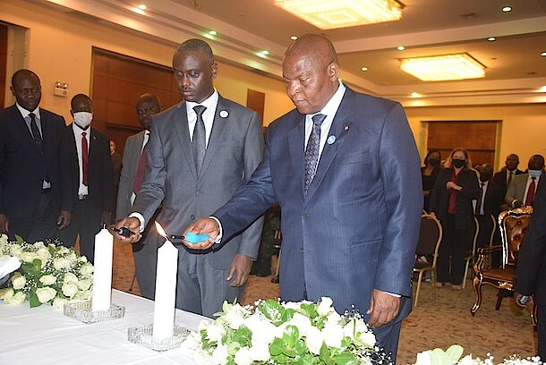 In his speech, Olivier KAYUMBA, Head of Rwanda Diplomatic Mission in CAR thanked President TOUADERA for joining Rwandan community in CAR for the 28th commemoration of Genocide against Tutsi in Rwanda in 1994. He stressed that Rwanda's history before 1994 was characterized by hatred, divisionism and dehumanization among the Rwandans that resulted into the loss of more than one million innocent people in 1994.