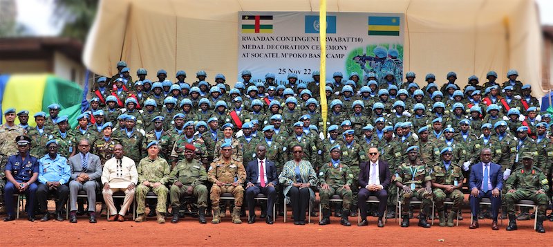 On 25 November 2022, Rwandan Peacekeepers under United Nations Multidimensional Integrated Stabilization Mission in the Central African Republic (MINUSCA) were decorated with UN Service Medals in an event that was held in Bangui City, at RWABATT10 HQs, Socatel M’Poko Base Camp.