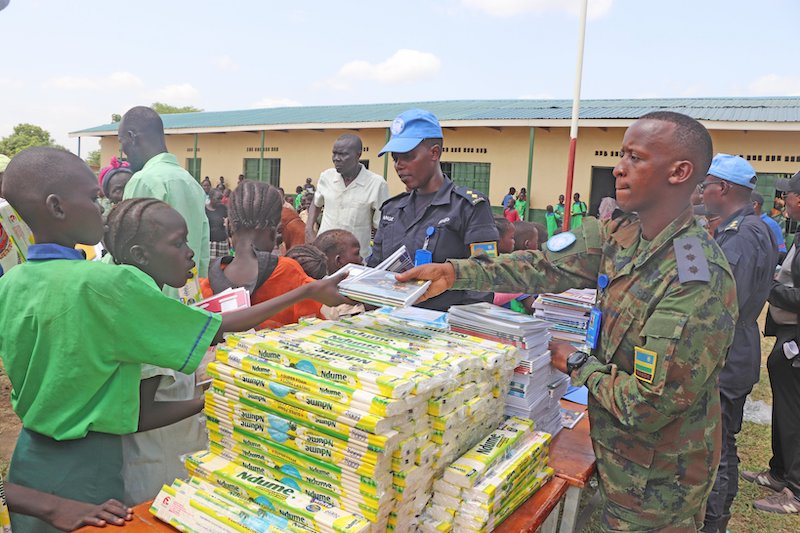 Rwandan peacekeepers in South Sudan conduct community work and donate scholastic materials to pupils